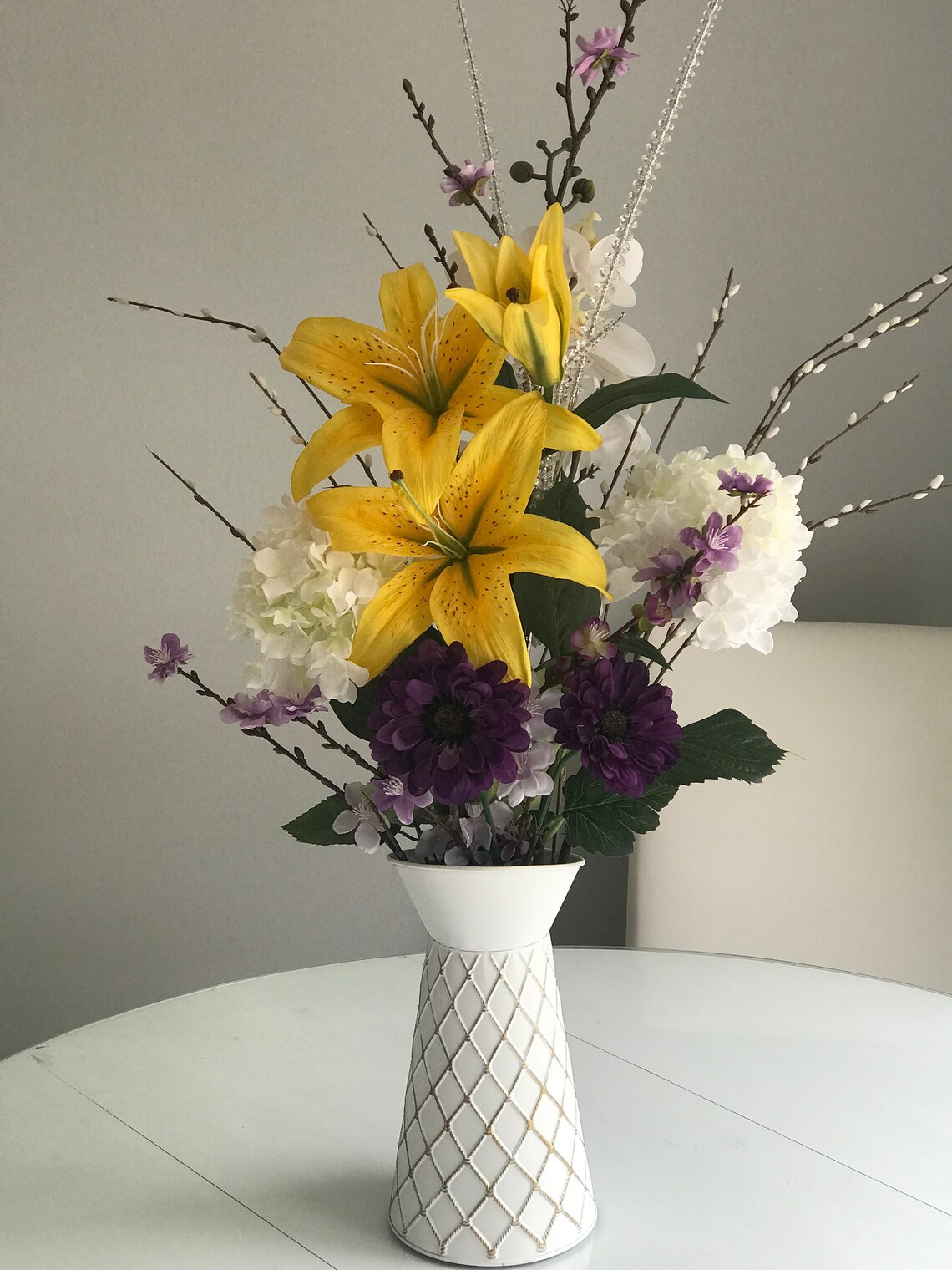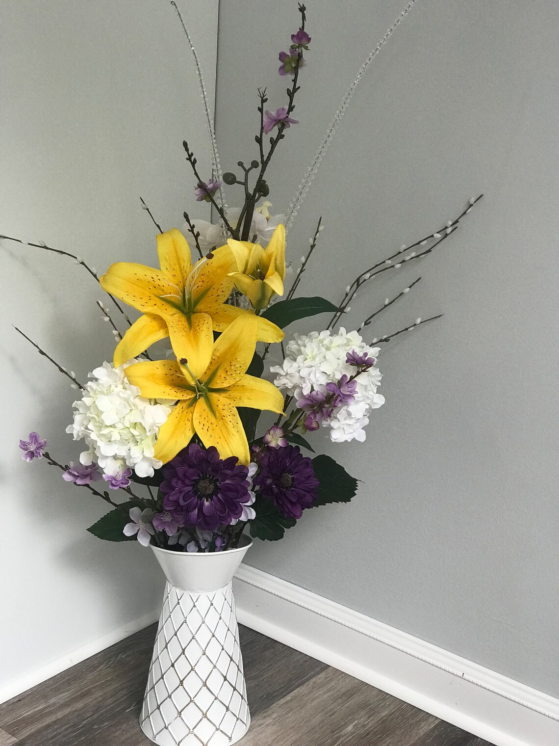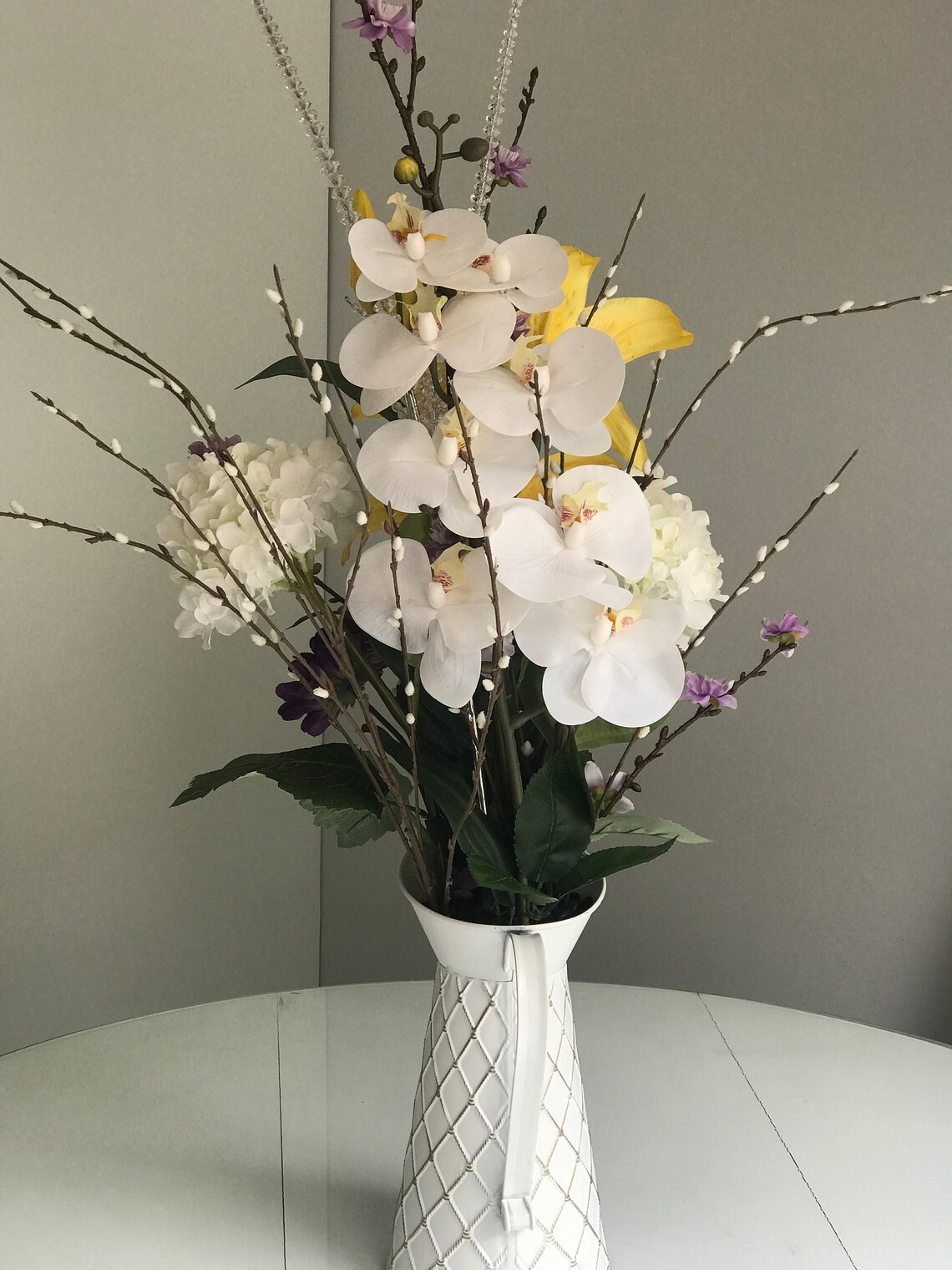 A beautiful all occasion arrangement inserted in a white metal vase. Yellow Lillies, purple gerbera daisies, white phalaenopsis, mini white chrysanthemums, lime boat orchids , lilac cherry blossoms, white pussy willows. It is adorned with an acrylic clear glass like artificial stem brings this arrangement to new heights with the finished arrangement standing 27 inches high by 8 inches wide.