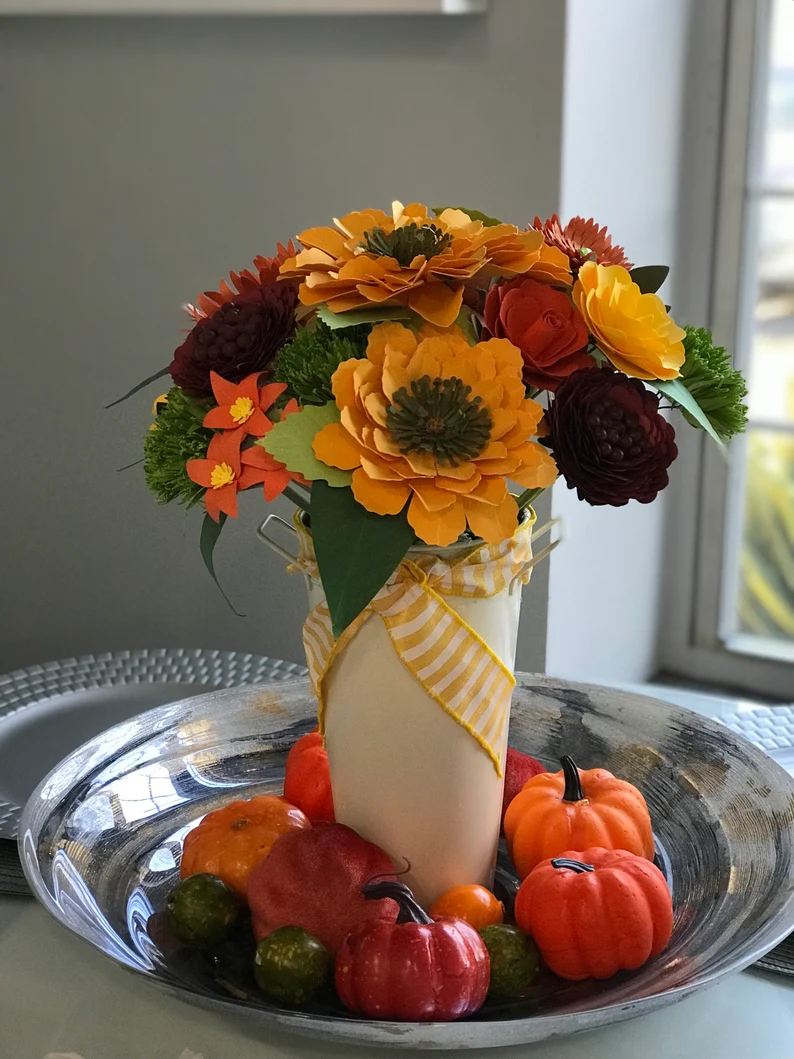 Handmade eco-friendly paper bouquet. This arrangement is handmade with premium satin card stock. It contains an array of fall colored stems including sunflowers, roses, marigolds, and peonies. The arrangement measures 15 inches in height.