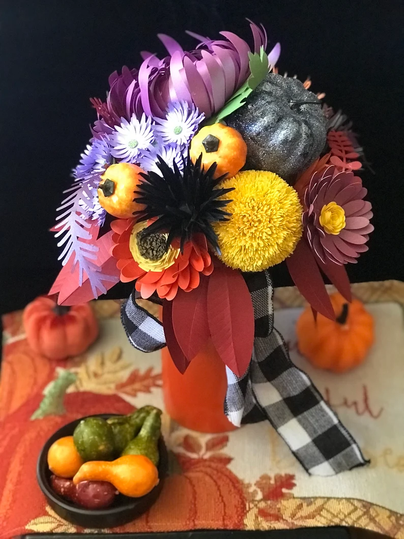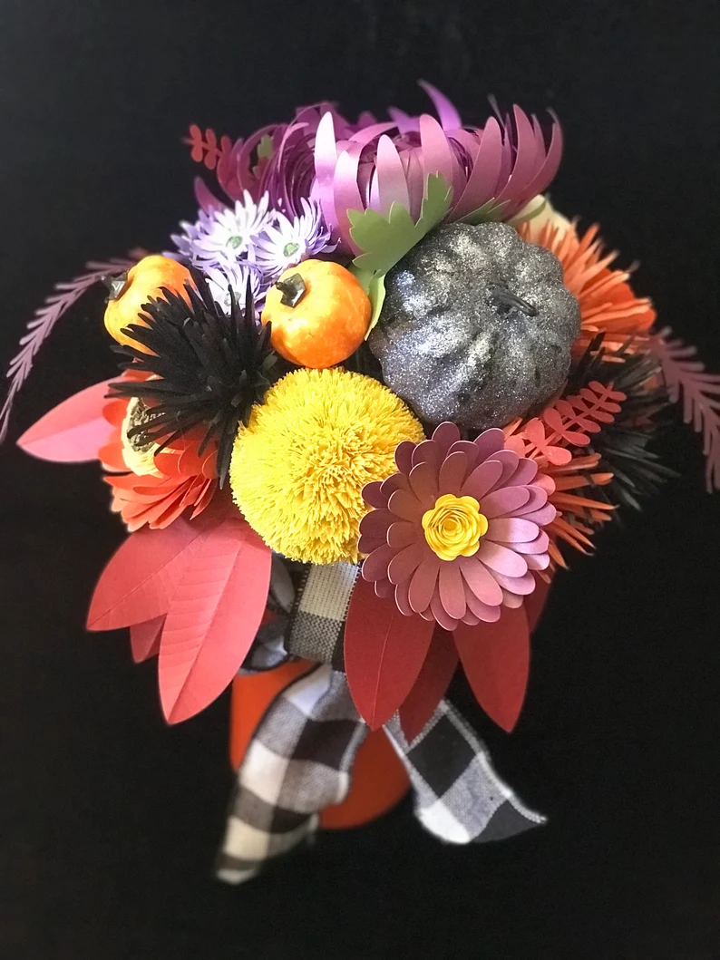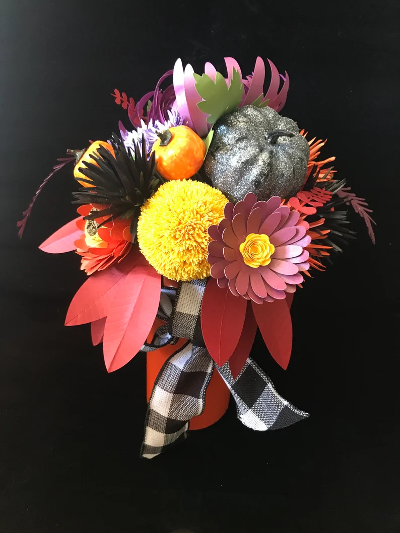 This lists a beautiful handmade paper flower arrangement for display on your table for the Halloween season. A vibrant mix of purple daisies, chrysanthemums, spider mums, and orange sunflowers adorn this arrangement. Flowers vary in size from 2-5 inches. The display is showcased in a bright orange vase, perfect for fall and Halloween. It is wrapped in burlap ribbon patterned in a black and white checkerboard fabric giving it that seasonal touch. You may choose to order your vase in orange, purple or black, or off-white, to complement your decor. Please contact me with specifics.