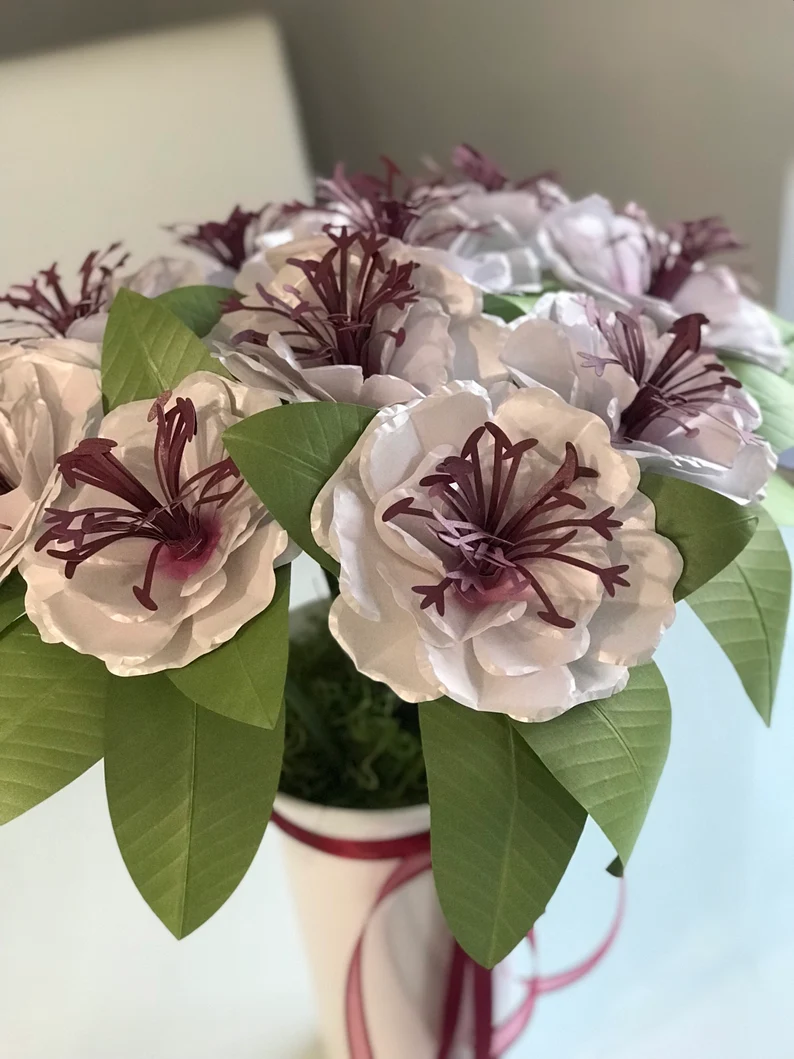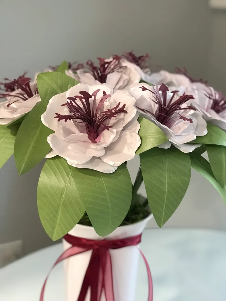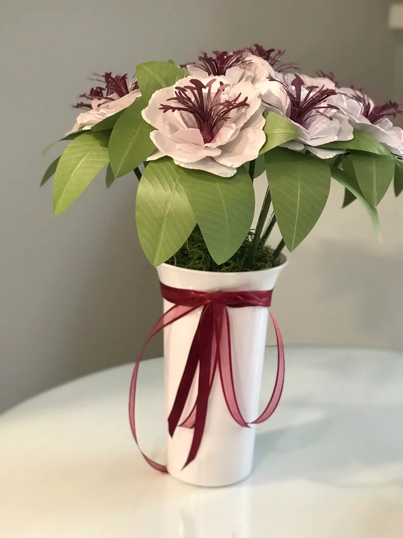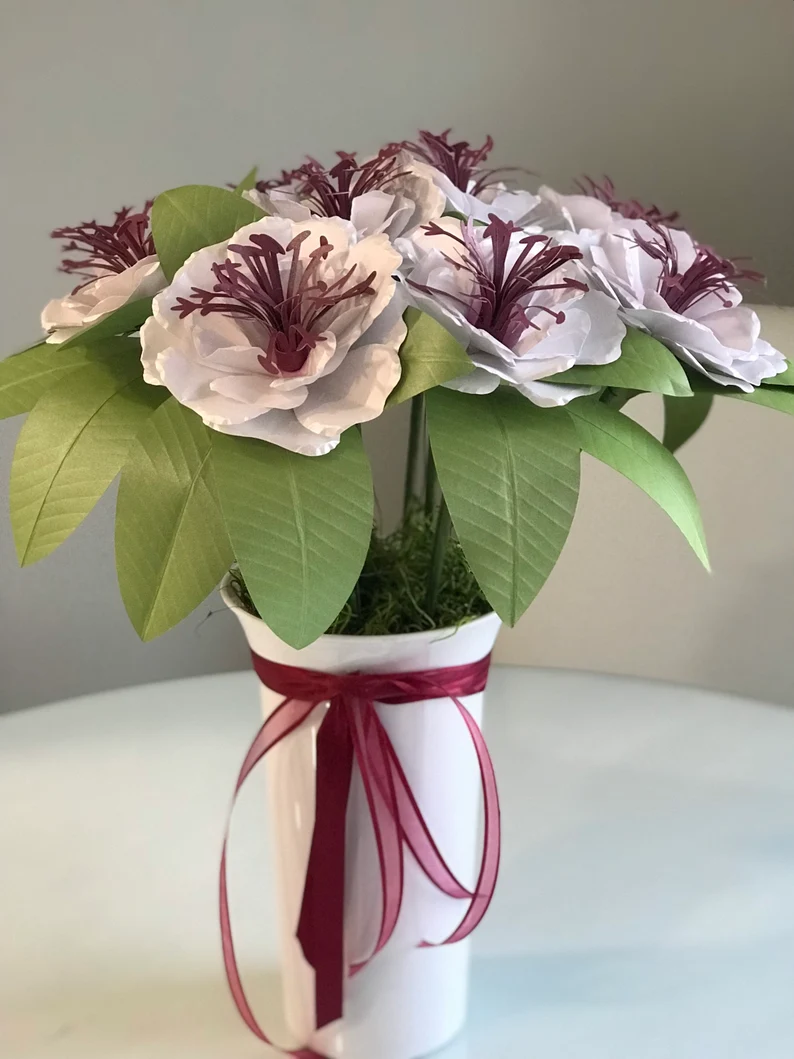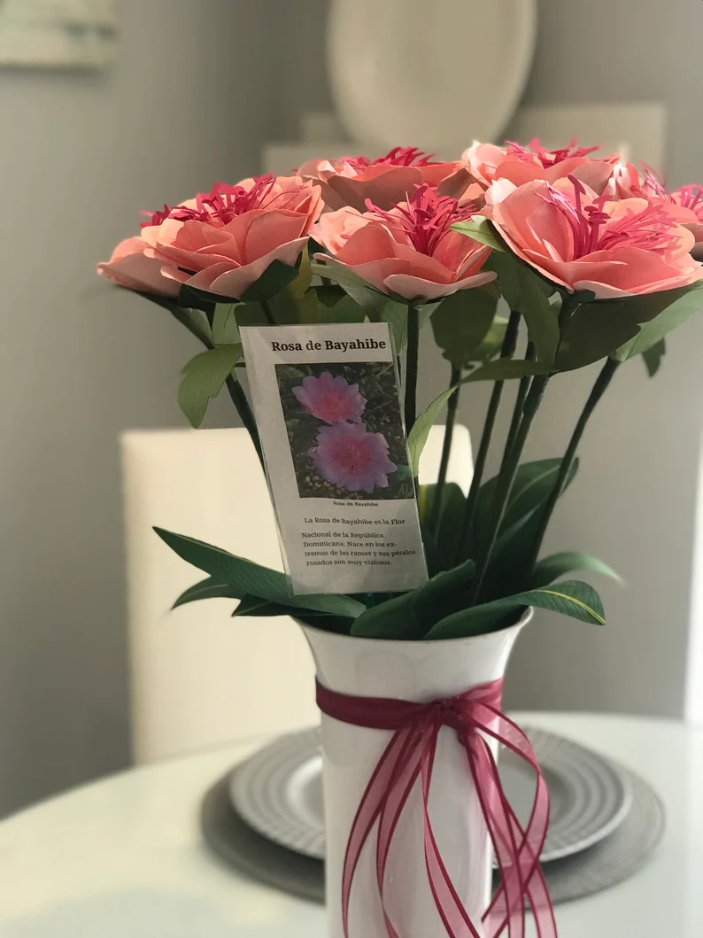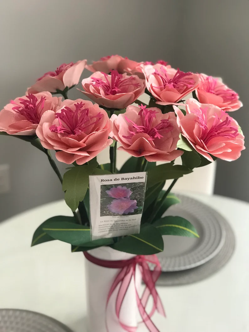 This beautiful handmade paper arrangement mimics the natural beauty of the original as occurring in nature, the National Flower of the Dominican Republic. It boasts 10 large blooms in pink with magenta stamens. Stands 20 inches tall by 14 inches in diameter. Enhance the aesthetics of your public event, party, or display anywhere in your home just because you love pink garden roses or flowers. We custom arrange, so the possibilities are endless for this display.