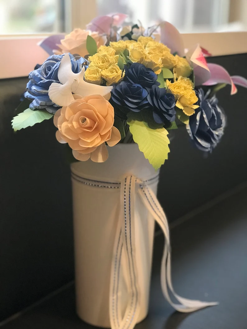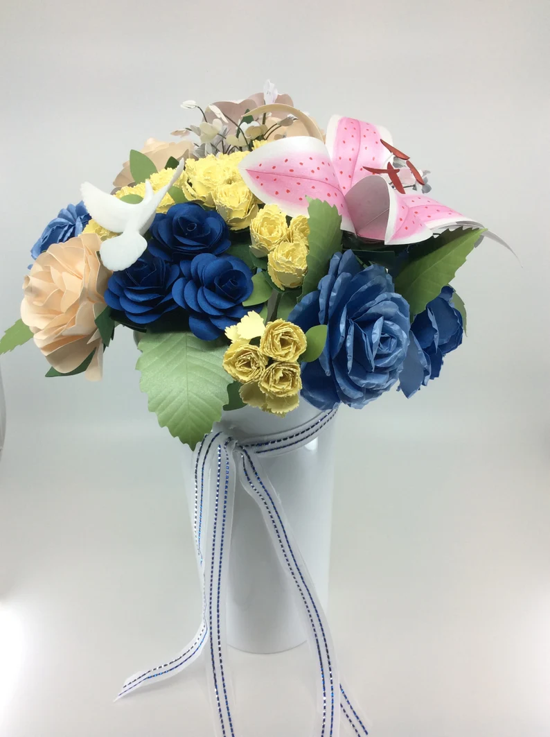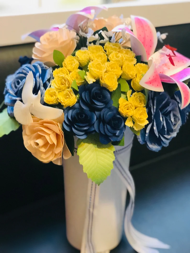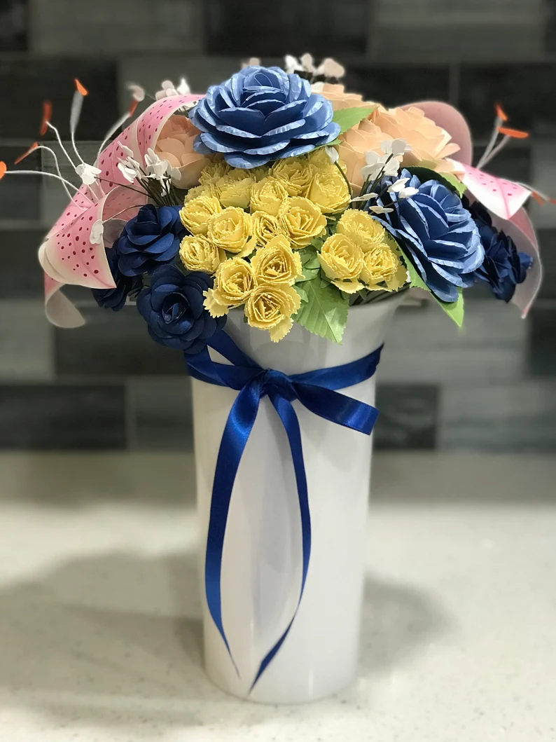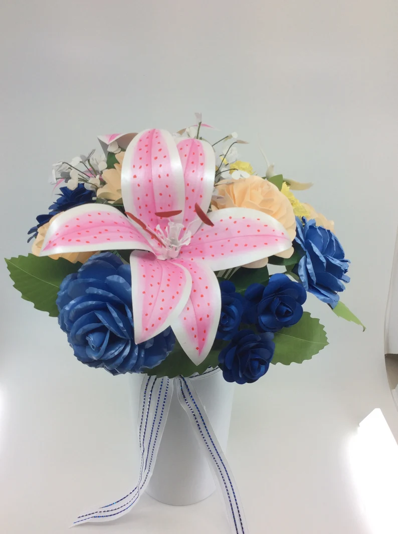 Custom mixed flower arrangement in white trumpet vase. Displays yellow mini carnations, baby blue roses, navy petite roses, and white and pink Lillies, Stands 15 inches high by 14 inches wide. Shows beautifully in a white blue and silver ribbon-wrapped vase.