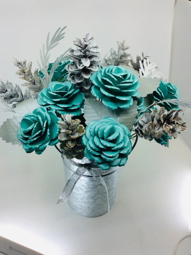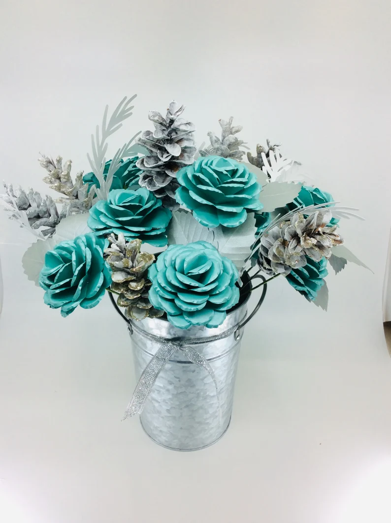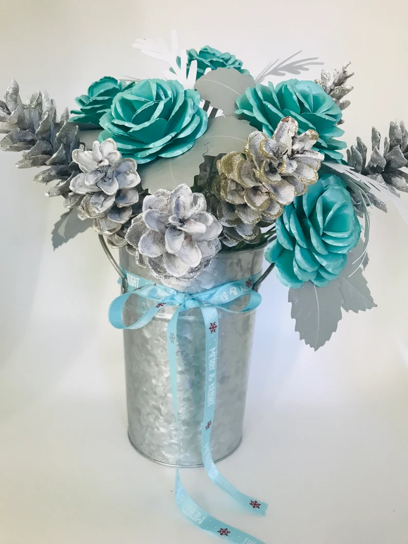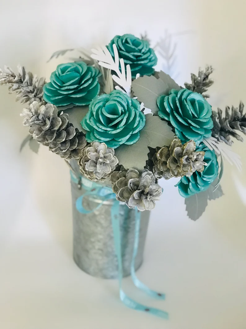 Beautiful winter floral centerpiece, 4-inch teal garden roses, silver and white leaves adorned with white and silver glistening pine cones for that winter feel. Constructed with durable Eco-friendly satin card stock. Flowers are arranged in a silver metal vase, adorned with teal blue ribbon.