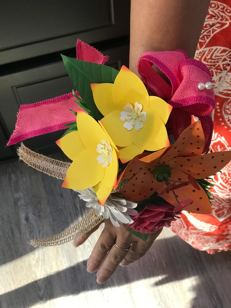 This listing is for a single corsage that can be worn on the wrist, arm, or pinned to clothing. It is handmade with satin, text weight, and card stock paper. This beautiful corsage is adorned with a combination of magenta roses, yellow hibiscus, and white Daises adorned with green leaves and a colorful pink and white ribbon. It measures 8 inches tall by 5 inches in width. The total number of flowers is eight. This corsage can be worn in three different ways. A bracelet clip on the back enables it to be worn as a wrist corsage. An attached ribbon also enables it to be tied on the upper arm or you can pin it to your clothing. The choice is yours!