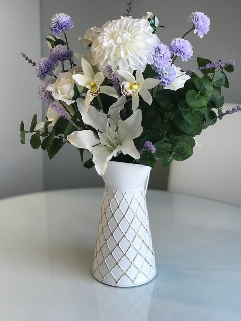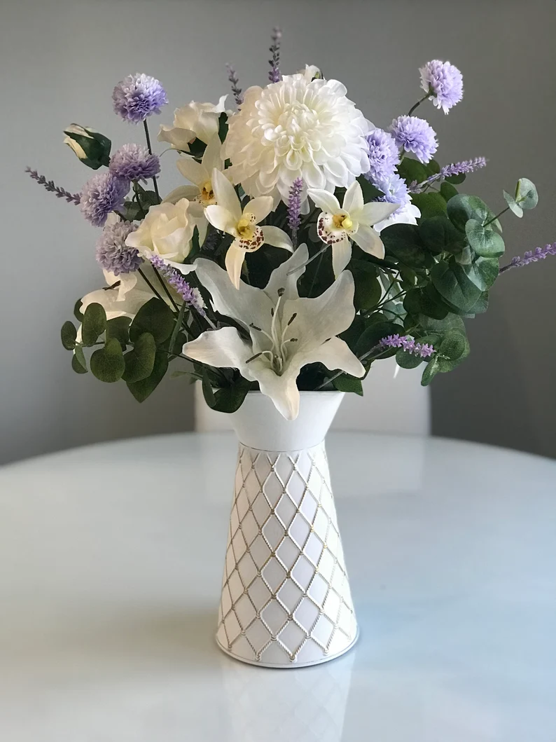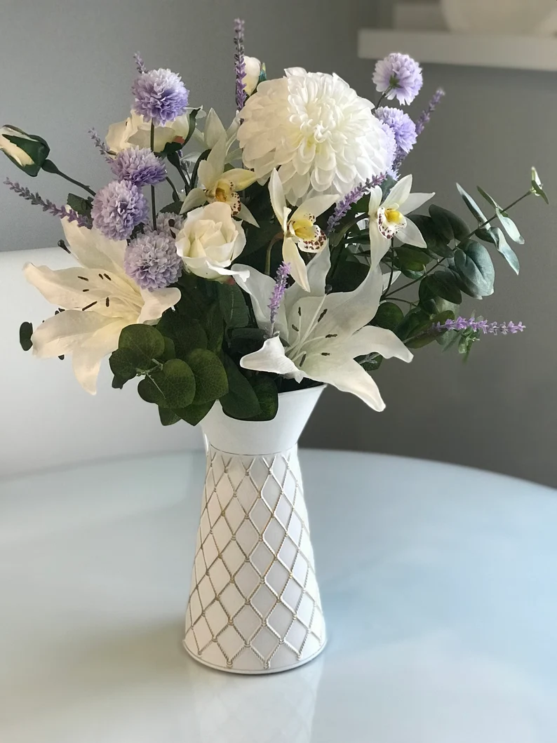 This bouquet of white and purple is an excellent choice to honor a loved one in their passing. Made with white and purple flowers, symbolizes peace, cleansing, purity, and admiration. This bouquet is planted in a white metal vase. The finished arrangement will stand 24 inches high by 12 inches wide. Flowers contained are white Lilly and yellow Cymbidium orchids, green silver dollar eucalyptus leaves, and purple asters. The material is silk and polyester.